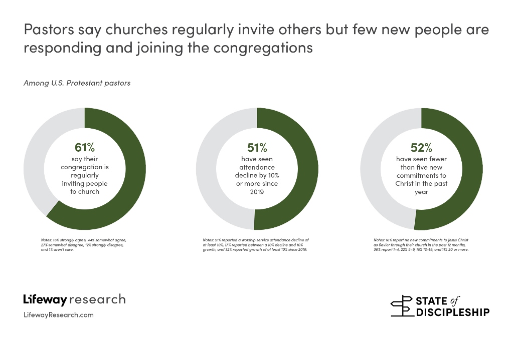 The lack of attendance growth is not from a lack of trying by many churches. According to pastors, 61% of congregations regularly invite people they meet to church. Still, the median congregation has seen four people indicate a new commitment to Jesus Christ as Savior through the church in the past 12 months. Around a quarter (26%) say 10 or more have made a new profession of faith, while 16% say they’ve had no new commitments in the last year.