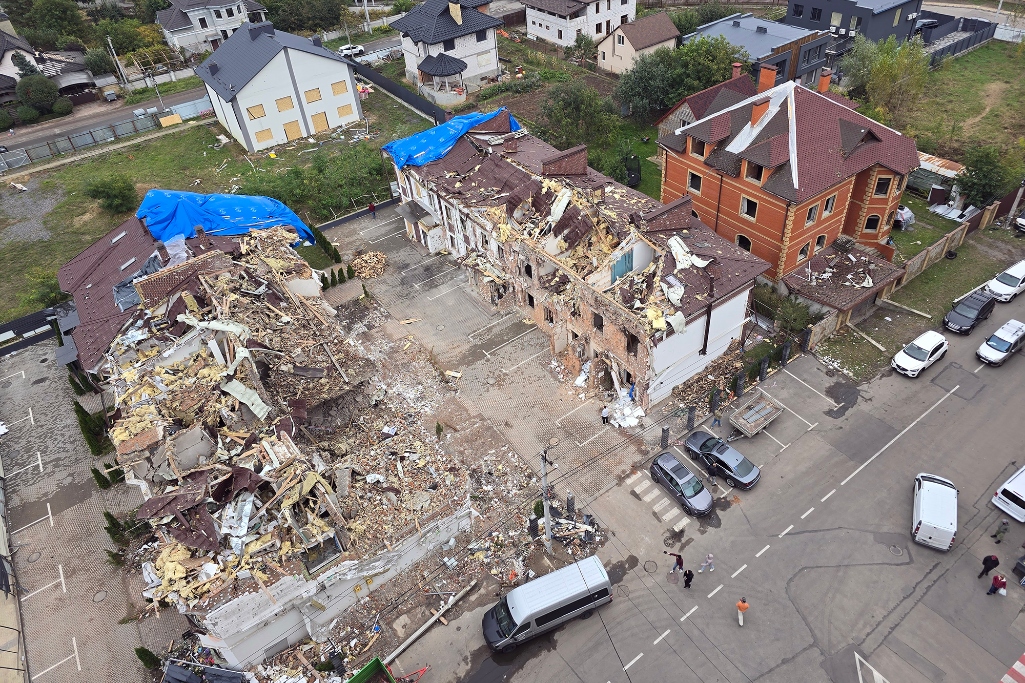 Aerial view of Pastor Mark Sergeev's neighborhood and home after a Sept. 29th Russian missile attack on Kyiv.